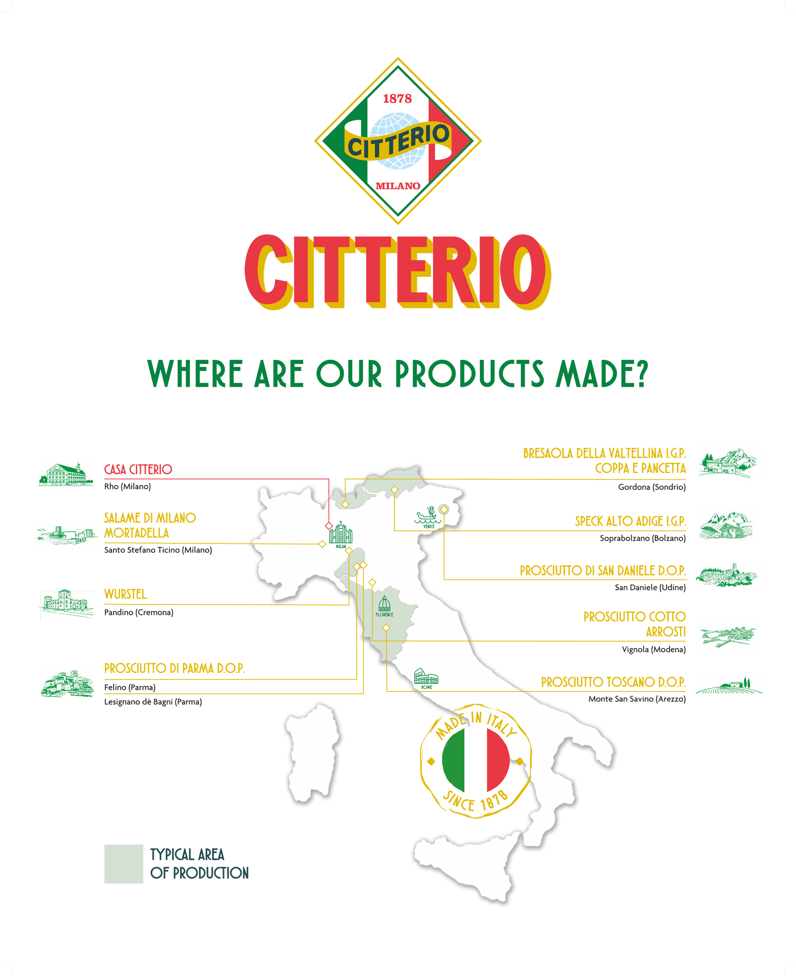 Citterio produces and distributes the whole range of the Italian Charcuterie products. It was founded in 1878, a year that would lead to a successful history of six generations of family-run business: from the invention of the Salame Milano to the Medaglie d’Oro to national and international expos, then on to technological innovations, cutting-edge analysis laboratories, the overseas factory and production facilities directly in the product’s place of origin, all the way up to Expo 2015. Today the name Citterio is synonymous around the world with professionalism, passion, innovation and quality